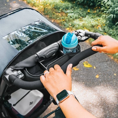 - Includes: Outdoor/Jogging stroller, Parent console with swivel lock and parking brake, Soft parent tray with 2 cup holders, Storage basket, UPF 50+ canopy with reflective detail